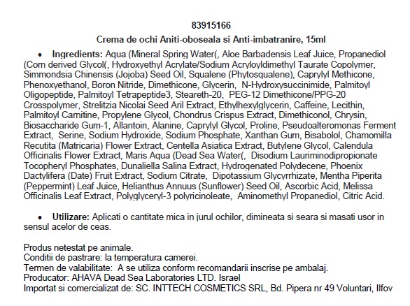 - Creata din agenti activi de netezire si stralucire de ultima-ora, impreuna cu Mineralele (Osmoter) Unice AHAVA exclusiv de la Marea Moarta inlatura cercanele si ridurile formate in jurul ochilor lasand un aspect fresh al ochilor.