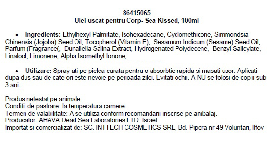 Un favorit al consumatorilor Ahava, acum cu o noua aroma. Cu un amestec calmant, parfumat si cu uleiuri nutritive, se usuca instant pentru a hidrata natural pielea. Acest spray parfumat cu ulei uscat Sea Kissed, invaluie instantaneu pielea cu un plus de hidratare care ofera o senzatie de moale si stralucire. Ofera o hidratare instanta, un plus de prospetime si o senzatie de piele atinsa de razele soarelui si de aerul sarat din mare.
