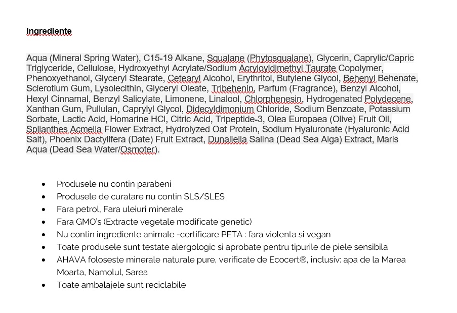 - AHAVA foloseste minerale naturale pure, verificate de Ecocert®, , inclusiv: apa de la Marea Moarta, Namolul, Sarea